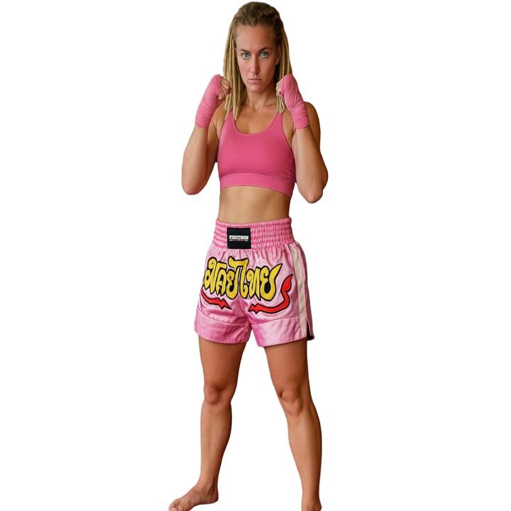 Kick-/Thaiboxing Shorts aus qualitativ hochwertigem edlem Satin. Hervorragende Verarbeitung (hand made). Pinke Hose mit gelben Schriftzug auf der Vorderseite und weissen Streifen. Mit breitem elastischen Bund und seitlichen Schlitzen für perfekten Tragekomfort. Schnürung in der Innenseite. Spezieller Schnitt für High-Kicks und Kniestösse.