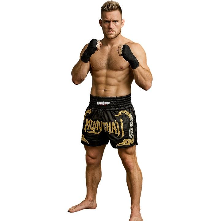 Kick-/Thaiboxing Shorts aus qualitativ hochwertigem edlem Satin. Hervorragende Verarbeitung (hand made). Schwarze Hose mit goldenem Muay Thai Schriftzug auf der Vorderseite.Mit breitem elastischen Bund und seitlichen Schlitzen für perfekten Tragekomfort. Schnürung in der Innenseite. Spezieller Schnitt für High-Kicks und Kniestösse.